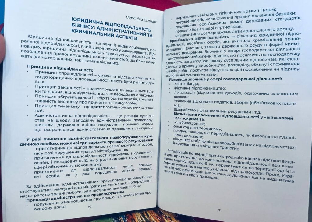 Підготовлені Веронікою Сметюх лекції та практичні кейси були спрямовані на підвищення компетентності учасників у питаннях юридичної відповідальності бізнесу. Спікер приділила окрему увагу особливостям ведення обліку військовозобовʼязаних на підприємствах та наголошувала на ефективній реалізації права на професійну правничу допомогу. Увесь навчальний матеріал, представлений експертами, було викладено у друкованому Посібнику, який учасники Школи матимуть, як своєрідну «дорожню карту» для ведення бізнесу.