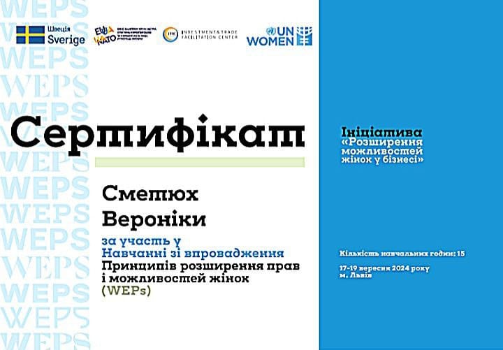 Команда АО «Філіппов та партнери» пишається не лише професійними здобутками колег, а також усіляко заохочує підвищення персональних лідерських навичок серед партнерів. Вероніку Сметюх серед інших 30 жінок-підприємниць України було обрано для участі у навчальному курсі ООН Жінки щодо впровадження Принципів розширення прав та можливостей жінок (WEPs) для досягнення гендерної рівності та підтримки розширення економічних можливостей жінок під час повномасштабної війни й післявоєнного відновлення.